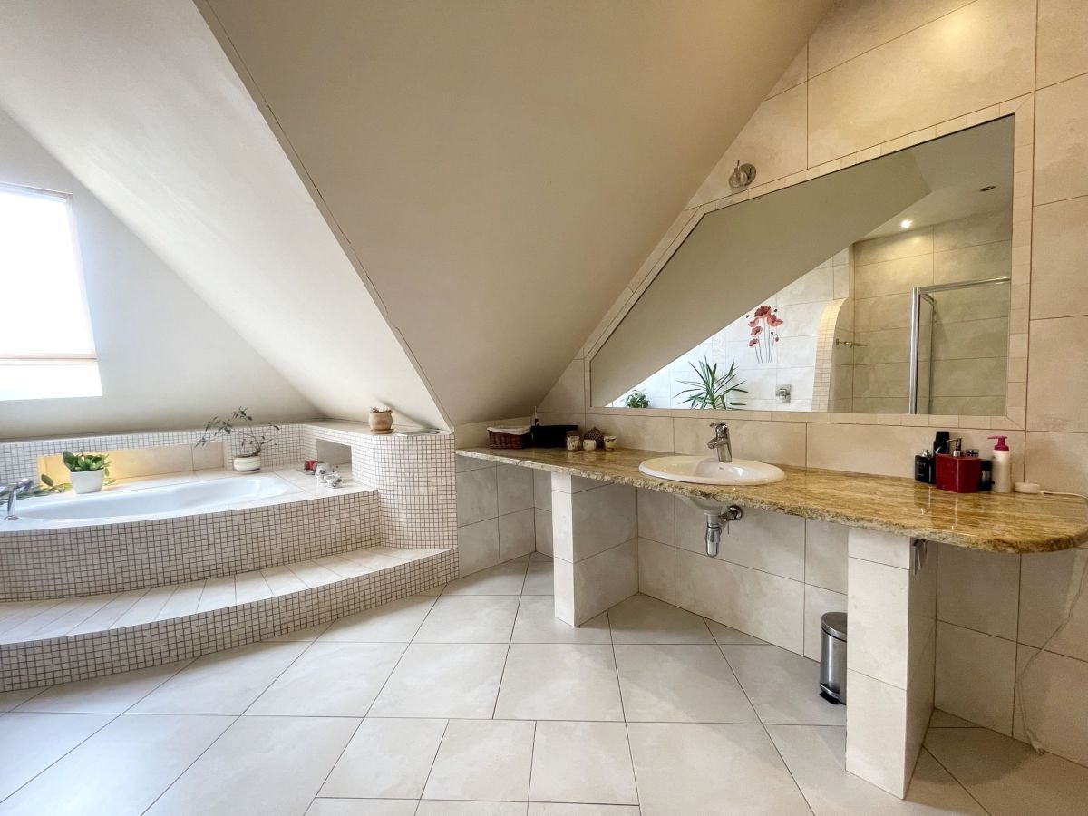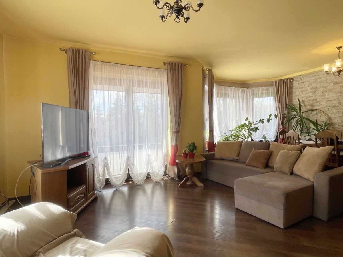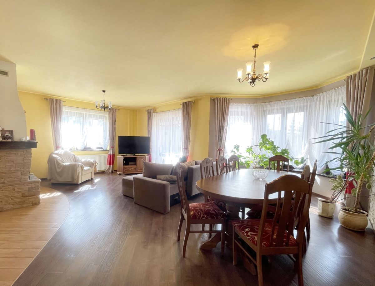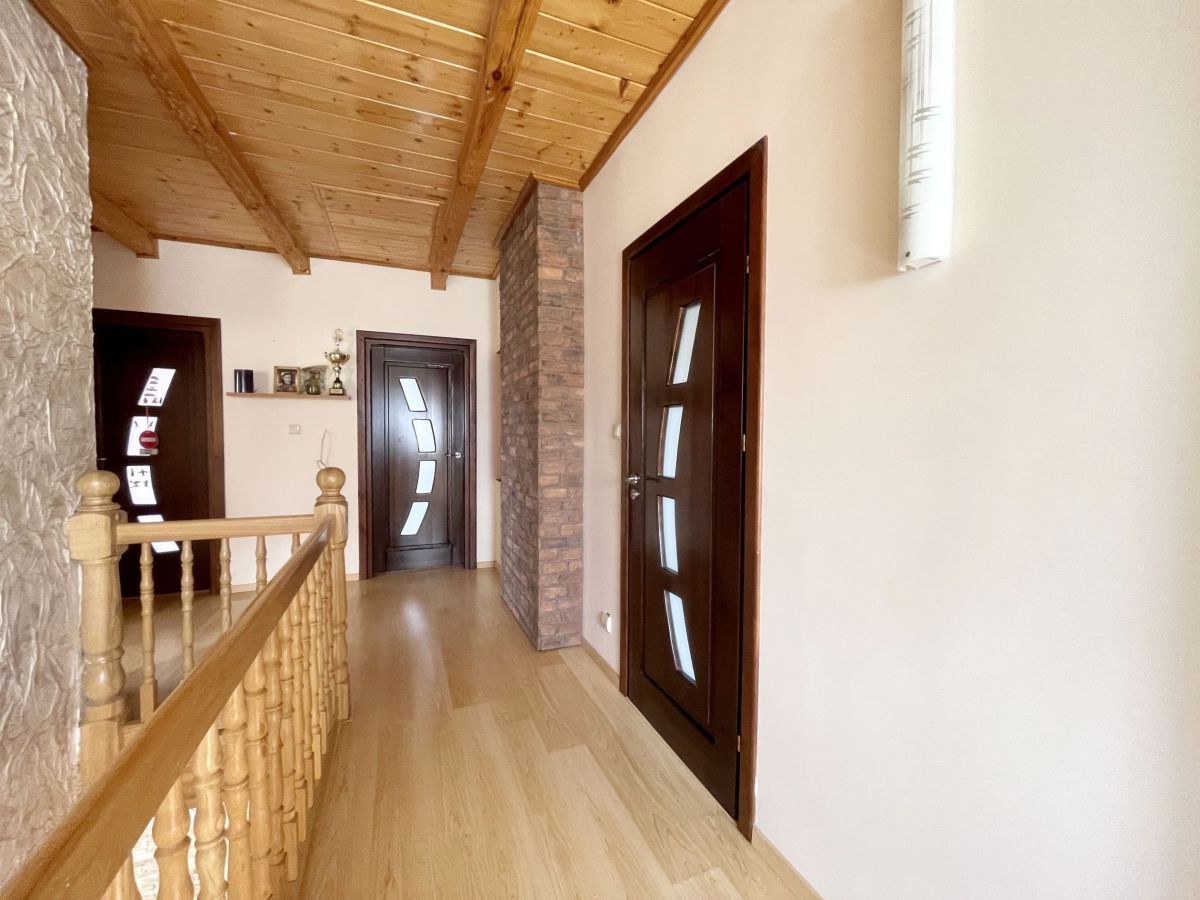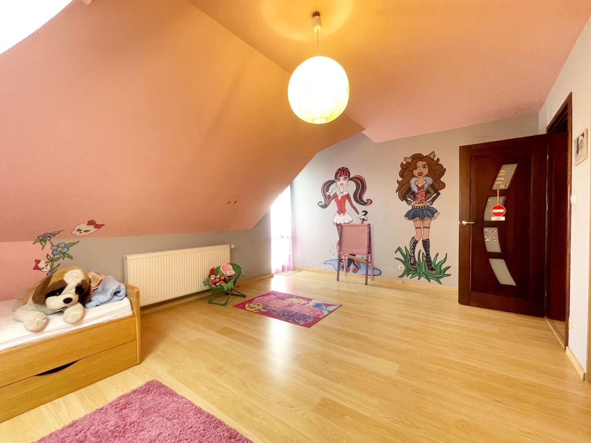 Na parterze domu znajduje się przestronny salon z wyjściem na taras, pokój gościnny, łazienka z prysznicem. Na poddaszu mamy 3 duże sypialnie, łazienkę z narożną wanną oraz prysznicem. Dodatkowo pomieszczenie idealne na pralnię. W głównej sypialni zabudowana garderoba. W bryle budynku duży garaż jednostanowiskowy. Dom wykończony z wysokiej jakości materiałów: gres, panele. Na ścianach gładź. Okna drewniane- 2 szybowe. Ogrzewany za pomocą pieca na eko-groszek. W salonie kominek ! W domu pozostają meble w zabudowie: w kuchni, szafy w pokojach. Atutami tej nieruchomości są: