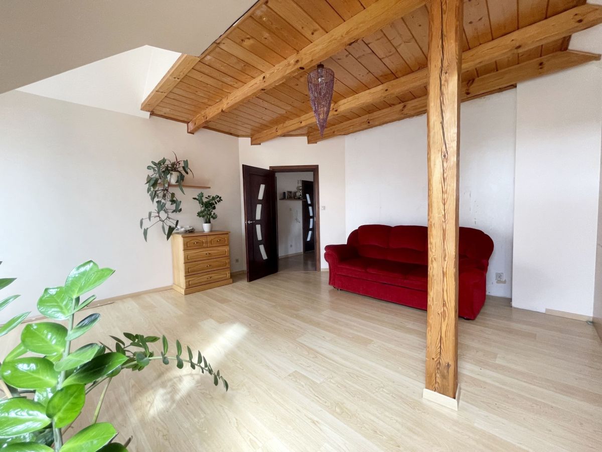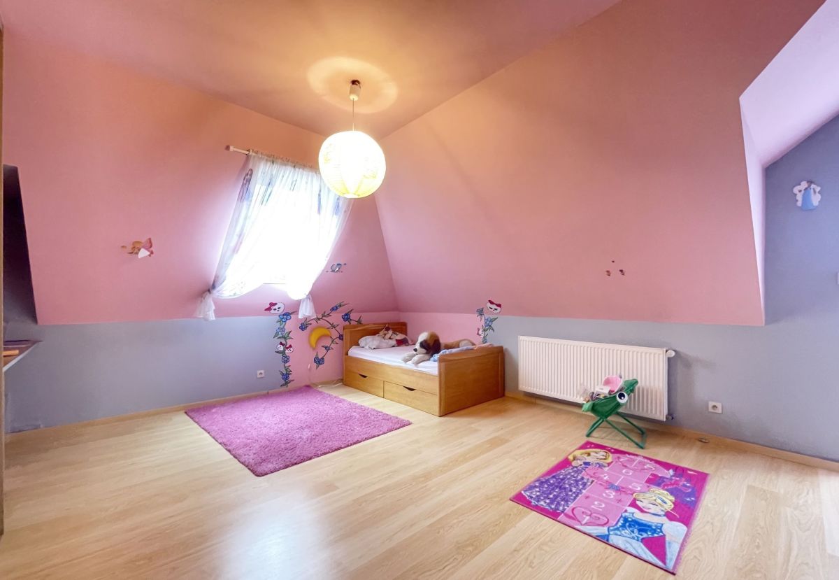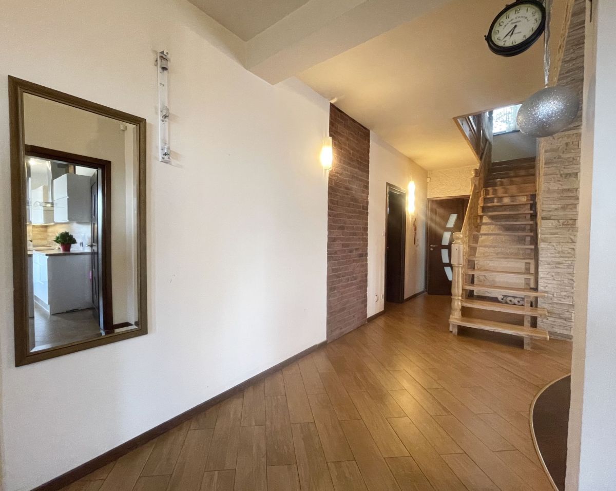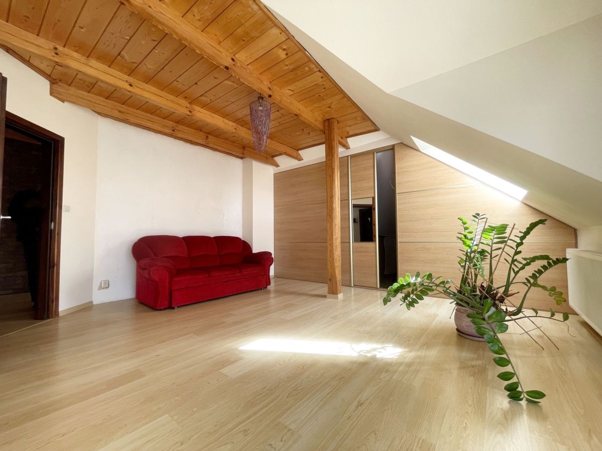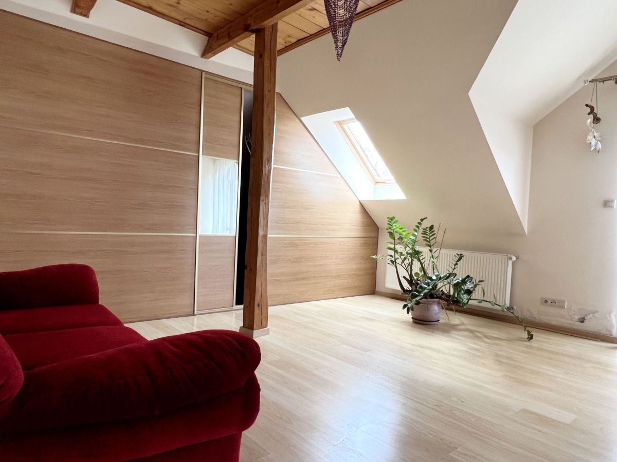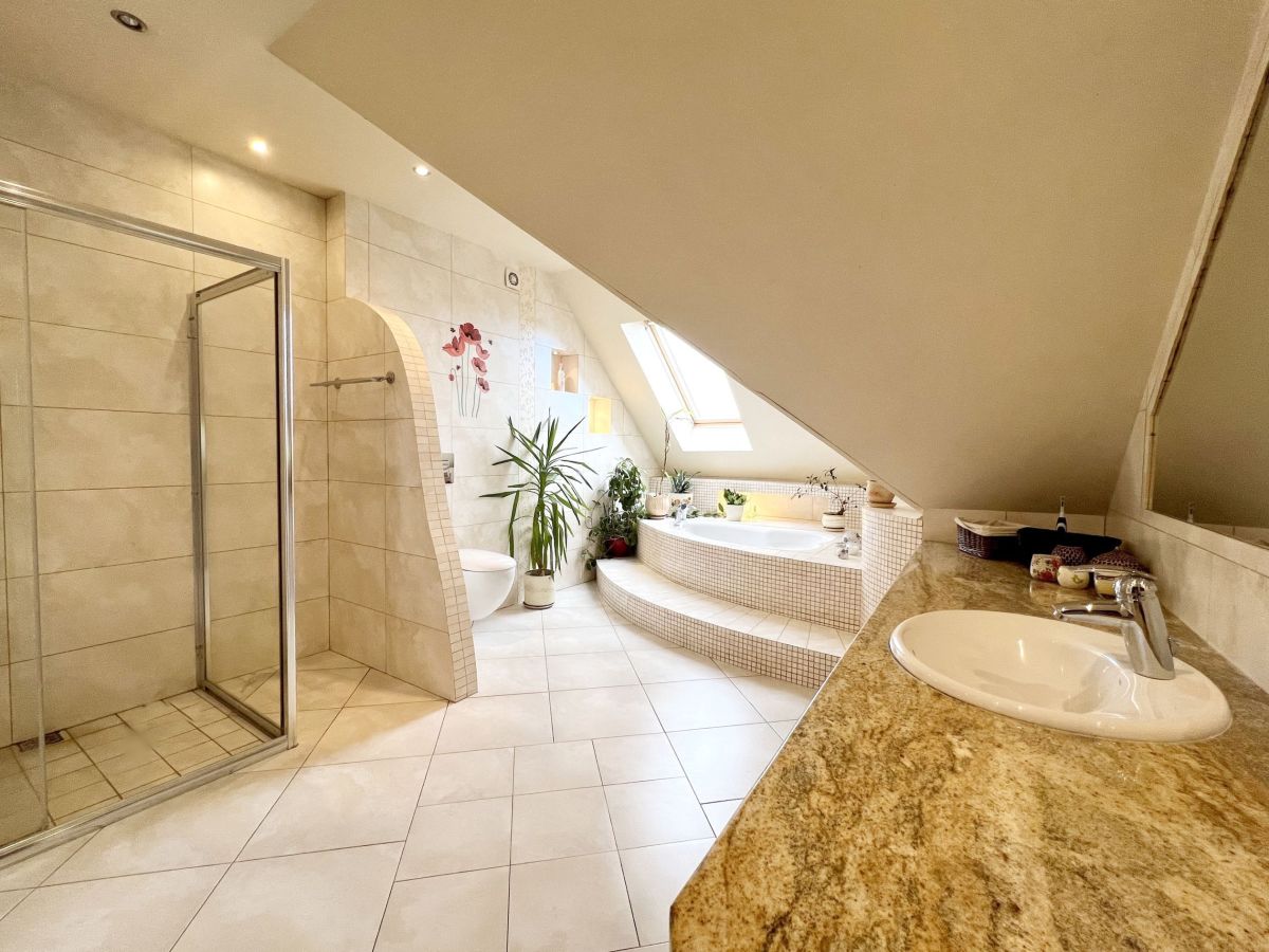 Na parterze domu znajduje się przestronny salon z wyjściem na taras, pokój gościnny, łazienka z prysznicem. Na poddaszu mamy 3 duże sypialnie, łazienkę z narożną wanną oraz prysznicem. Dodatkowo pomieszczenie idealne na pralnię. W głównej sypialni zabudowana garderoba. W bryle budynku duży garaż jednostanowiskowy. Dom wykończony z wysokiej jakości materiałów: gres, panele. Na ścianach gładź. Okna drewniane- 2 szybowe. Ogrzewany za pomocą pieca na eko-groszek. W salonie kominek ! W domu pozostają meble w zabudowie: w kuchni, szafy w pokojach. Atutami tej nieruchomości są: